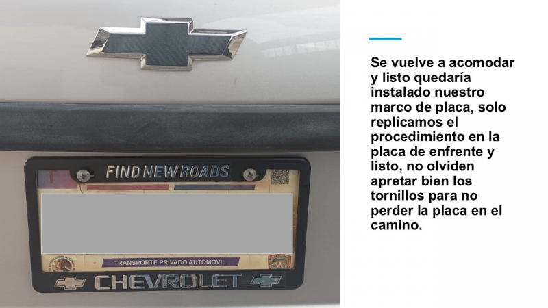 Se vuelve a acomodar y listo quedaría instalado nuestro marco de placa, solo replicamos el procedimiento en la placa de enfrente y listo, no olviden apretar bien los tornillos para no perder la placa en el camino.