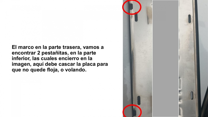 El marco en la parte trasera, vamos a encontrar 2 pestañitas, en la parte inferior, las cuales encierro en la imagen, aquí debe cascar la placa para que no quede floja, o volando.