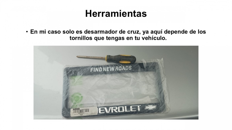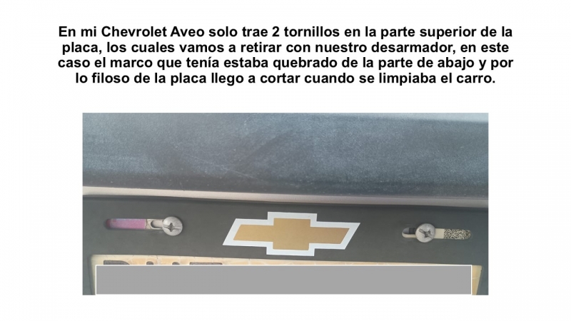 En mi Chevrolet Aveo la placa trasera, solo trae 2 tornillos en la parte superior de la placa, los cuales vamos a retirar con nuestro desarmador, en este caso el marco que tenía estaba quebrado de la parte de abajo y por lo filoso de la placa llego a cortar cuando se limpiaba el carro.