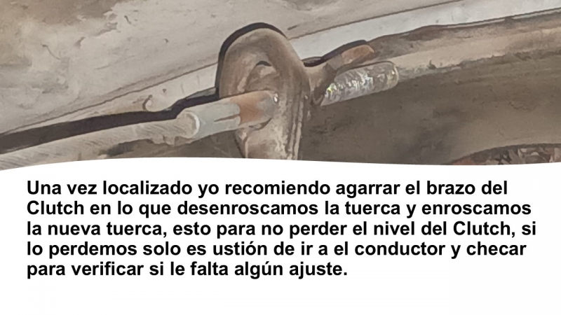 Una vez localizado yo recomiendo agarrar el brazo del Clutch en lo que desenroscamos la tuerca y enroscamos la nueva tuerca, esto para no perder el nivel del Clutch, si lo perdemos solo es ustión de ir a el conductor y checar para verificar si le falta algún ajuste.