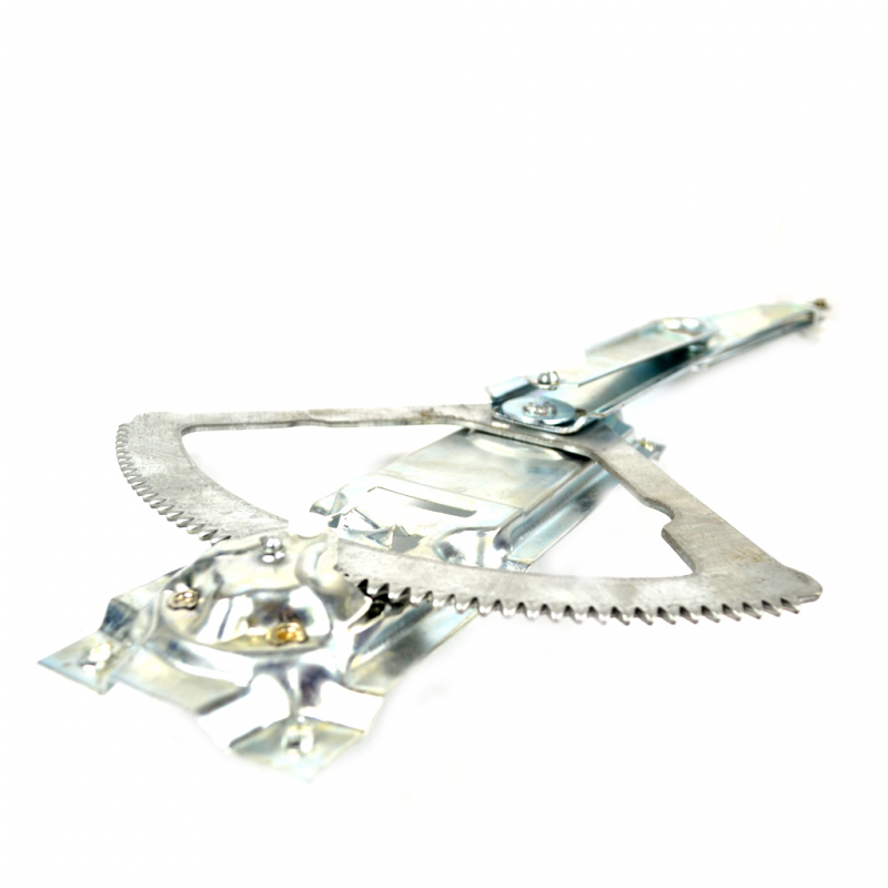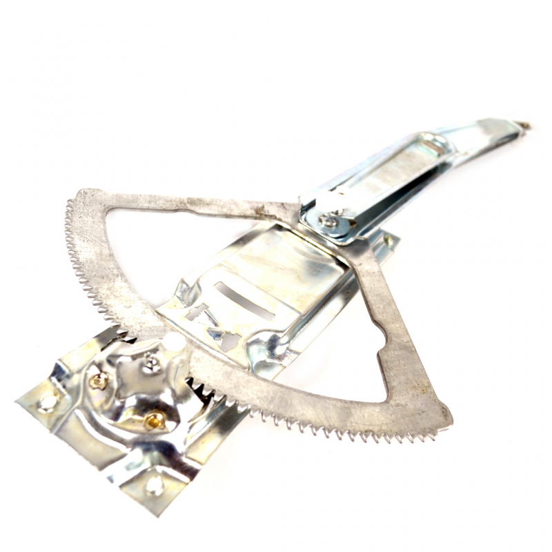 El cristal puede subir y bajar gracias a mecanismos como este que mediante un engrane podemos ajustar la altura del vidrio por medio de la manija, este elevador es muy curioso porque no utiliza el sistema estandarizado de poleas y cables como casi todos los demás coches, lo que lo hace más sólido en su composición y con casi ningún punto débil, excepto las muelas plásticas que tiene e las puntas de sus brazos móviles. Lo que determina su avería son los dientes, ya que cuando se barren, no podrán engancharse a la manija y entonces no habrá manera de volver a subir los cristales.
